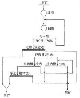 褐鐵礦石浮選-強磁選礦流程廣泛用于處理低品位礦石。強磁選適于分選粗粒礦物,浮選適于分選細粒礦物,兩者互為補充,擴大了粒級回收范圍。其選礦流程結構有強磁選得精-磁尾浮選和強磁選拋尾-磁精浮選兩種。